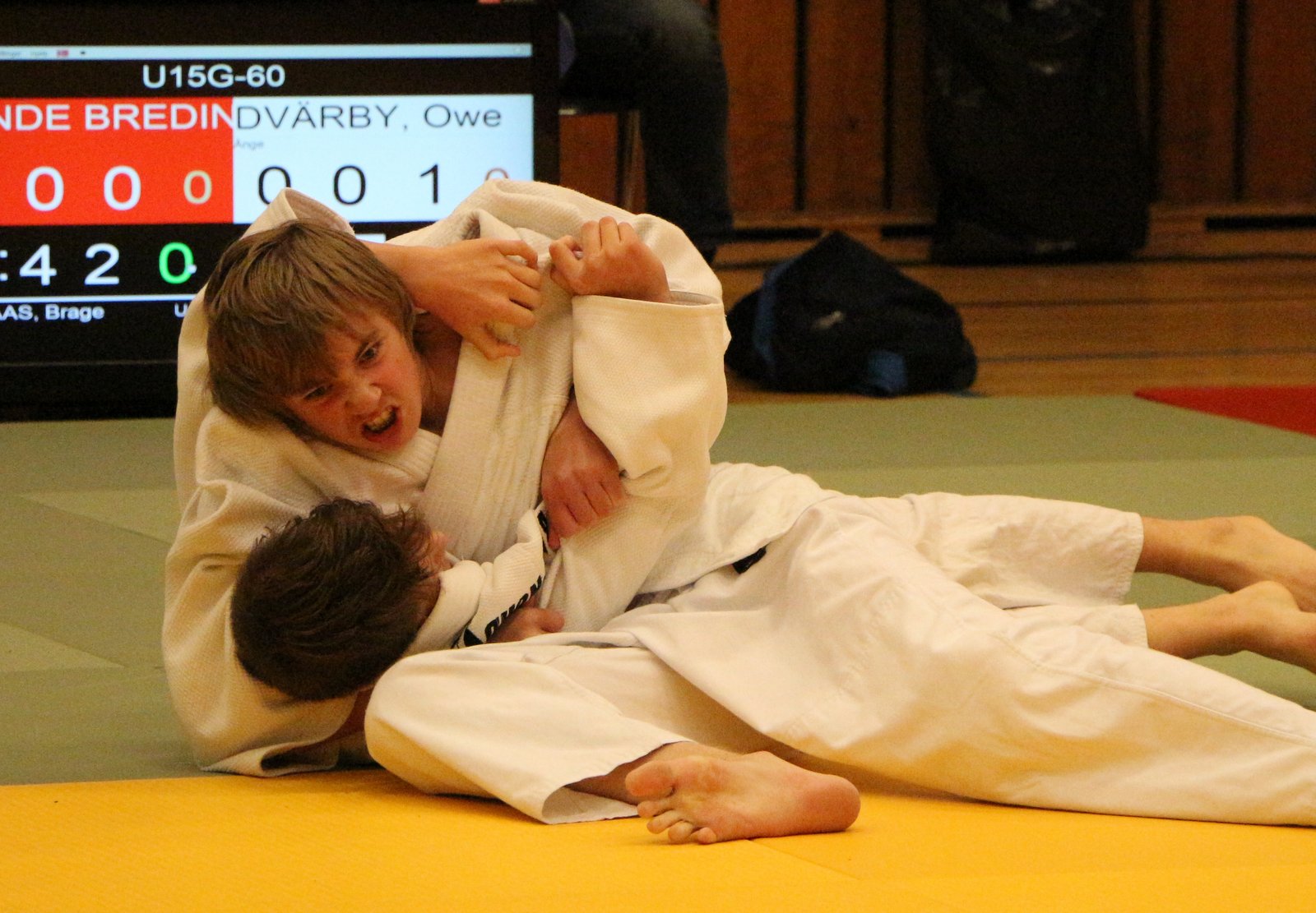 Bronsevinner Sander Sunde Breding tar fram judotrynet. «Han prøvde jo å stikke av» sa Breding etter kampen.