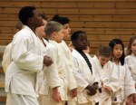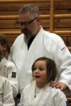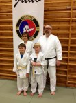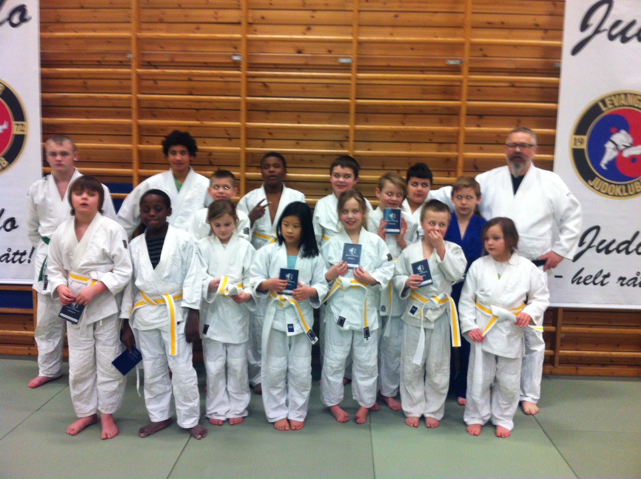 Stolte utøvere med ferskt gult belte sammen med sensor Alf Birger Rostad. Marcus Leonhardsen og Titan Steinvik assisterte ved graderinga.