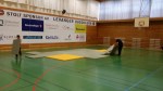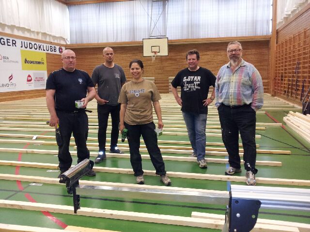Mandag 16.6. ble arbeidet med det nye golvet startet for fullt. Det hele startet med at Ragnar Norum hadde en liten brief om arbeidsoppgaver og tekniske detaljer for bygging av golvet. Skal golvet få optimal funksjon, må spesifikasjonene fra det franske firmaet Decasport følges nøye. Så var det bare å gå løs på å bære ut matter før man kunne begynne å legge ut treverket (lektene). Arbeidet vil fortsette hver dag kl 1800, så det er bare å møte opp!