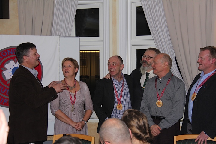 Alf Birger Rostad og Snorre Johansen fra Levanger Judoklubb deltok på festen, og hadde selvsagt med gaver. Først fikk kwaiens leder Johnny Roaldseth overrakt en glassvase med inngravering, etterfulgt av hederlig omtale. Deretter ble anledningen benyttet til å gi hedersmedaljer i tre til fire utvalgte. Den som deltok i Trøndercup på 70-tallet kjenner igjen medaljene. -Jeg har laget mange sånne, fortalte Hans Rechsteiner, som var sentral som stevneleder den gangen, og en av dem som fikk medaljen. I 1979 laget Steffen Kirknes den første digitale kampklokka, og fikk sin medalje for dette. Klokka ble sendt rundt på mange av landet stevner i en «amerikakoffert». Unni Kirknes var sentral som dommer i mange år. «Landets beste dommer», sa Alf Birger Rostad, da Unni fikk sin hedersmedalje. Til slutt fikk kwaiens mangeårige trener og leder Johnny Roaldseth sin hedersmedalje. Og Johnny er like gammel som Trondheim Judokwai. Gratulerer!
