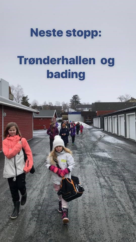 Klokken 8.30 var alle oppe og klare for frokost. Allerede klokken 10 var treningsøkt nummer 2 i gang. Alle jentene syntes den var litt for kort. Så etter en liten lunsj, gikk vil alle ned til Trønderhallen hvor bassenget ventet. Været var ikke det beste med kald vind og sludd, men jentene klaget ikke. I svømmehallen var det satt opp en hinderløype som ble svært så populær, men de jevnaldrende gutta som trodde jentene skulle bli en lett mach å få fjernet, fant raskt ut at jentene erobret hinderløypa. Til gjengjeld fikk alle andre også slippe til etter tur.