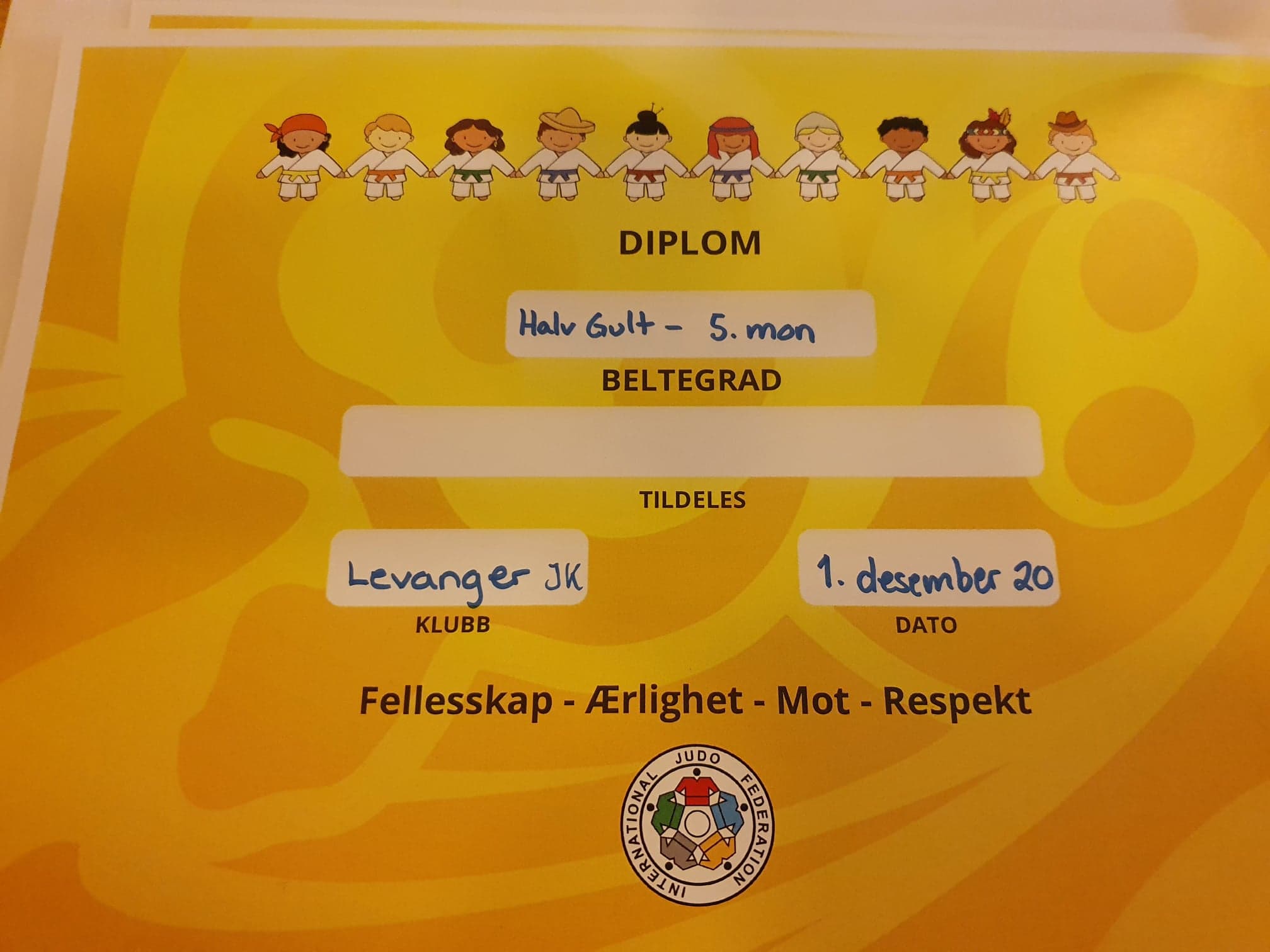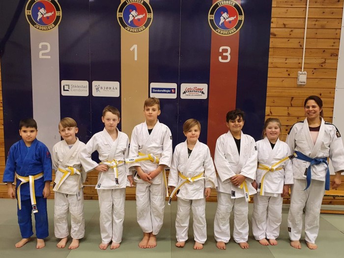Endelig ble det litt gulfarge på beltene til nybegynnergruppa for barn. Tirsdag 1.12. kunne trener Evelyn Gulstad Otlo dele ut diplomer og belter til stolte barn. Graderinga gjaldt halvt gult belte, og til våren gjøres gulbeltegraderinga ferdig. – Graderinga bestod av deashi-harai, hiza-guruma, sasae-tsurikomi-ashi, uki-goshi, hon-kesa-gatame , yoko-shiho-gatame, og ord og uttrykk vi bruker, forteller Evelyn. I tillegg til dette kommer fallteknikk. Vi gratulerer alle sammen med nytt belte!